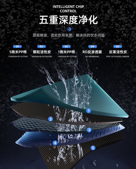 采用PP棉濾芯+顆粒活性炭濾芯+精密PP棉濾芯+RO反滲透膜濾芯+后置活性炭濾芯,五重過濾,層層精濾,高效去除自來水中的泥沙、鐵銹、水垢、重金屬、細菌等等還有物質,讓師生們喝到的每一滴水都是安全健康的。