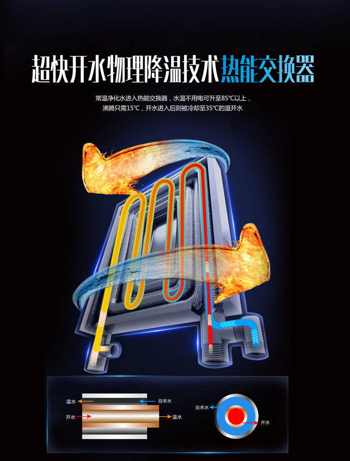 先進的熱交換技術,可連續不斷地供應溫開水,所有的溫開水都是開水經過熱交換器物理降溫而成,出水溫度在40攝氏度左右,即取即飲,健康暢飲。