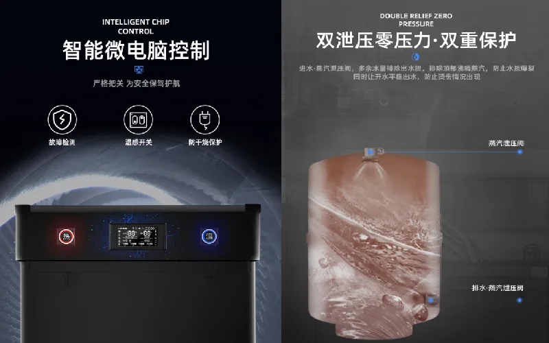 智能微電腦控制,自動對設備進行檢測,發現故障立即報警;雙泄壓雙重保護,防止水爆裂;充分考慮學生在實際使用中的情況,還加入更多的安全設計,讓學生們在使用過程中更安全,讓老師、家長們更放心。