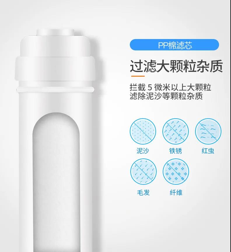 PP棉的作用:主要濾除水中的大顆粒物質,如泥沙、鐵銹、膠體等,同時還能對后續濾芯起到保護的作用。由于是第一級濾芯,很容易污堵,所以需要經常更換,但成本不是很高。