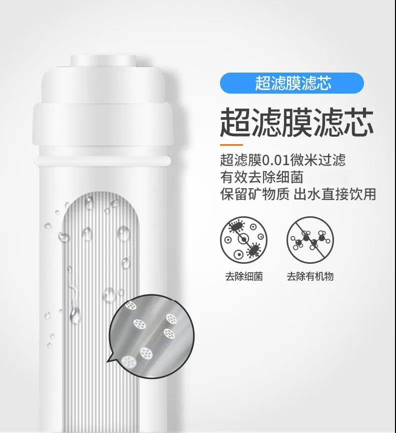 超濾膜濾芯的作用:水中的細菌以及比細菌體積大得多的膠體、鐵銹、懸浮物、泥沙、大分子有機物等都能被超濾膜截留,一般用于凈水機的第三級。過濾精度達0.01μm。