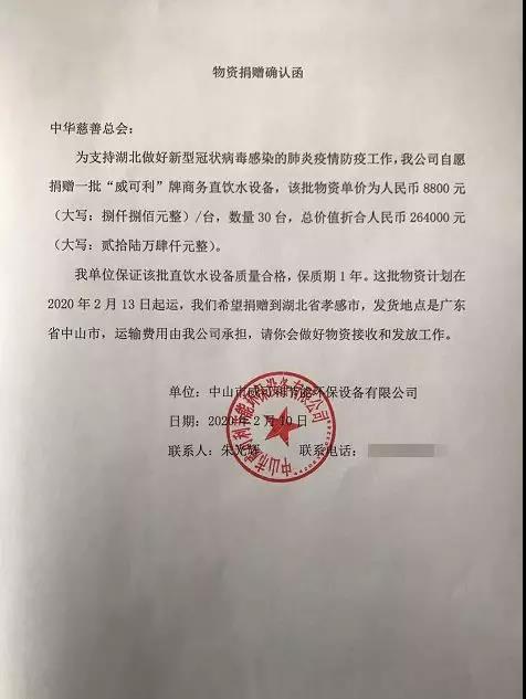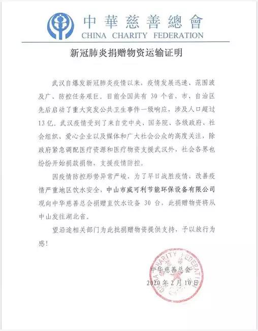 當前,新型冠狀病毒感染的肺炎疫情已全面進入攻堅戰,中山市威可利節能環保設備有限公司決定通過中華慈善總會,向湖北孝感市捐贈一批“威可利”牌商務直飲水設備,并組建團隊為受贈單位提供技術支持。為奮戰在一線的醫護人員提供一杯安全的凈水!