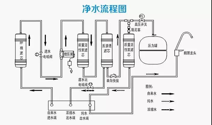 原水(自來水)通過水管進入RO反滲透直飲水機的前三級濾芯進行初濾,然后在由增壓泵對水施壓,讓水流進RO反滲透膜中,通過RO膜的逆滲透效果精細凈化水源,然后在將水輸送到壓力桶,由壓力桶保存;當需要使用時在打開壓力桶球閥,通過壓力桶施壓讓水流入最后一級后置活性炭濾芯(主要為凈化水質口感),在通過水龍頭產水。詳情可參考凈水流程圖。