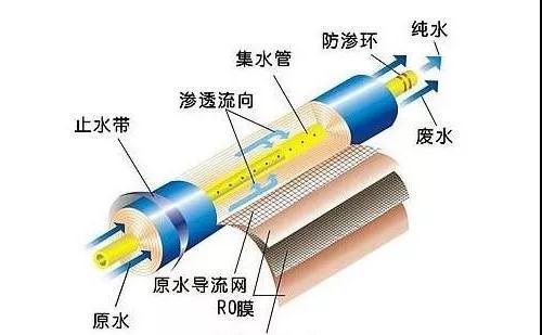 反滲透技術是利用壓力差為動力的膜分離過濾技術,其孔徑小至納米級(1納米=10-9米 ),在一定的壓力下,H2O分子可以通過RO膜,而源水中的無機鹽、重金屬離子、有機物、膠體、細菌、病毒等雜質無法透過RO膜,從而使可以透過的純水和無法透過的濃縮水嚴格區分開來。